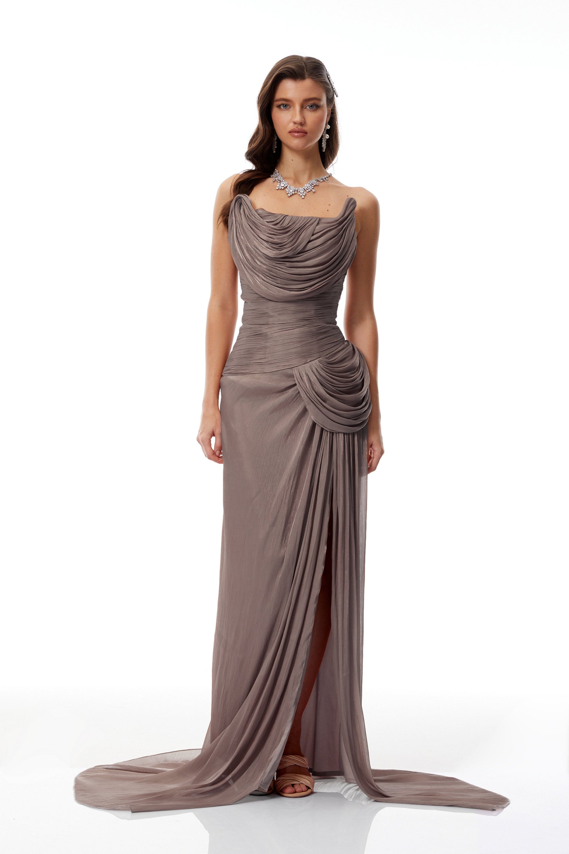Gelsomina Grey Asymmetrical Glossy Gathered Maxi Dress